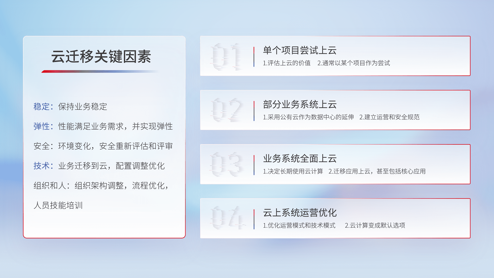 结合实际业务,,,从规划设计、、、云平台选型、、、云原生改造、、数据迁移、、、集成交付,,,,迁移全过程为客户识别最佳上云路径,,做好风险识别管理,,,,设计网络架构、、身份权限、、、安全审计合规、、、操作审计、、、日志审计、、、监控告警策略、、、、多站点容灾设计等,,,,对云上基础设施进行整体规划,,提升IT治理水平,,以满足弹性、、高可用、、高性能的需求。。。。