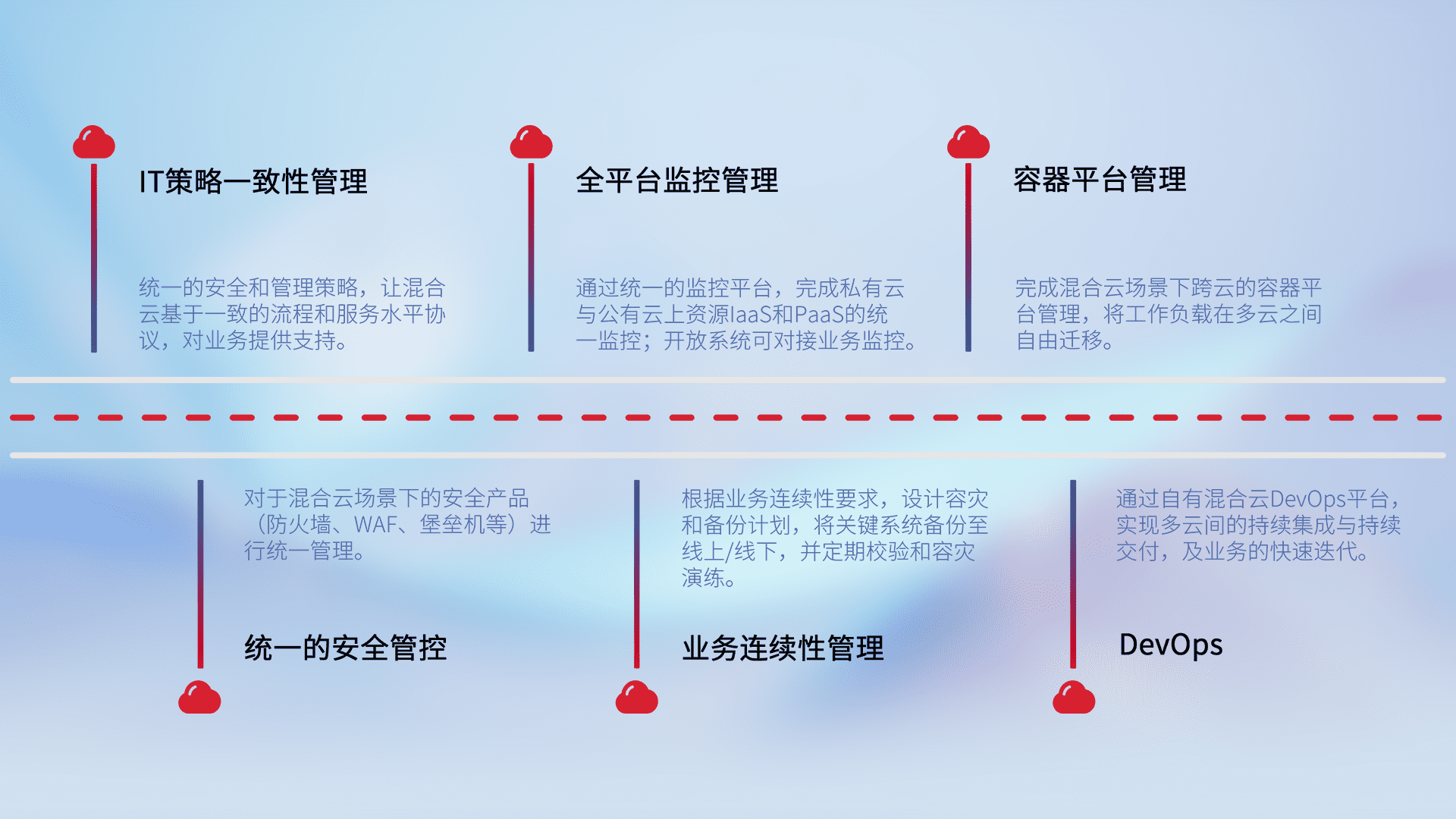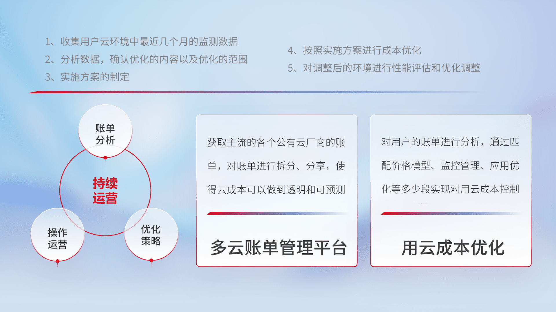 通过多云纳管,,以统一的资源数据模型把客户的云资源进行抽象和封装,,进而实现对多云资源的统一操作,,,保障云资源管理的可靠性、、、、稳定性与可用性。。。量身定制化运维内容,,,配置、、、、开发运维、、、、补丁管理、、、备份、、监控、、、、认证和访问管理、、审计和日常巡检等,,,,保障在用云过程中的可靠度,,,,稳定度以及高可用率。。。