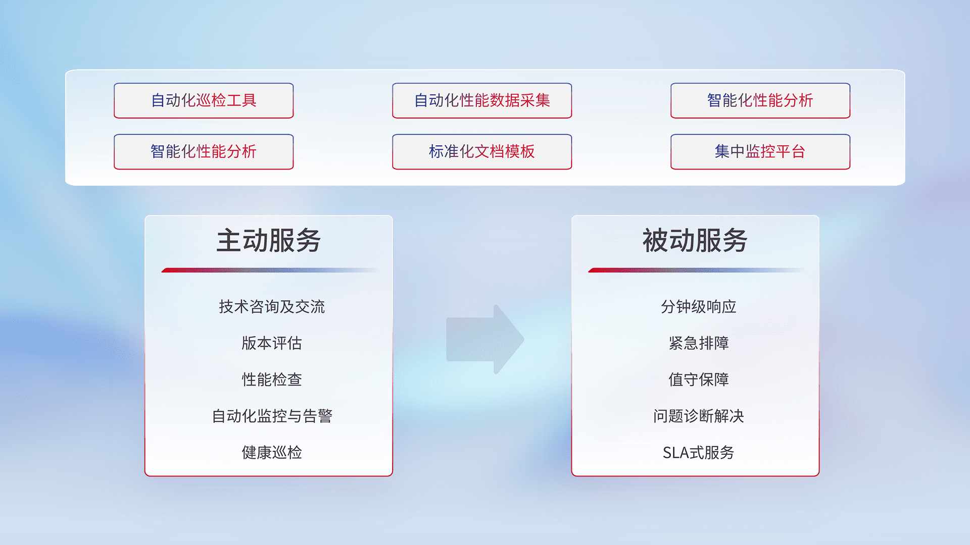 智能化工具和标准化文档,,保障服务质量,,,,提供主动服务(包含技术咨询、、版本评估、、、、性能检查、、、自动化监控与告警、、、健康巡检)和被动服务包含(分钟级响应、、、、紧急排障、、、、值守保障、、问题诊断解决、、SLA服务)。。